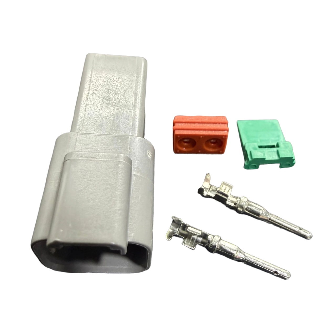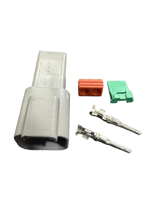 Utilizare: Set complet gata de montat pentru realizarea unui conector tata Deutsch DTP cu 2 pini. Terminalele se crimpuiesc pe fire (4-6 mm²) si se introduc in carcasa. Clips-ul de blocare asigura retentia mecanica a terminalelor. Compatibil cu setul mama B-DT62PC.