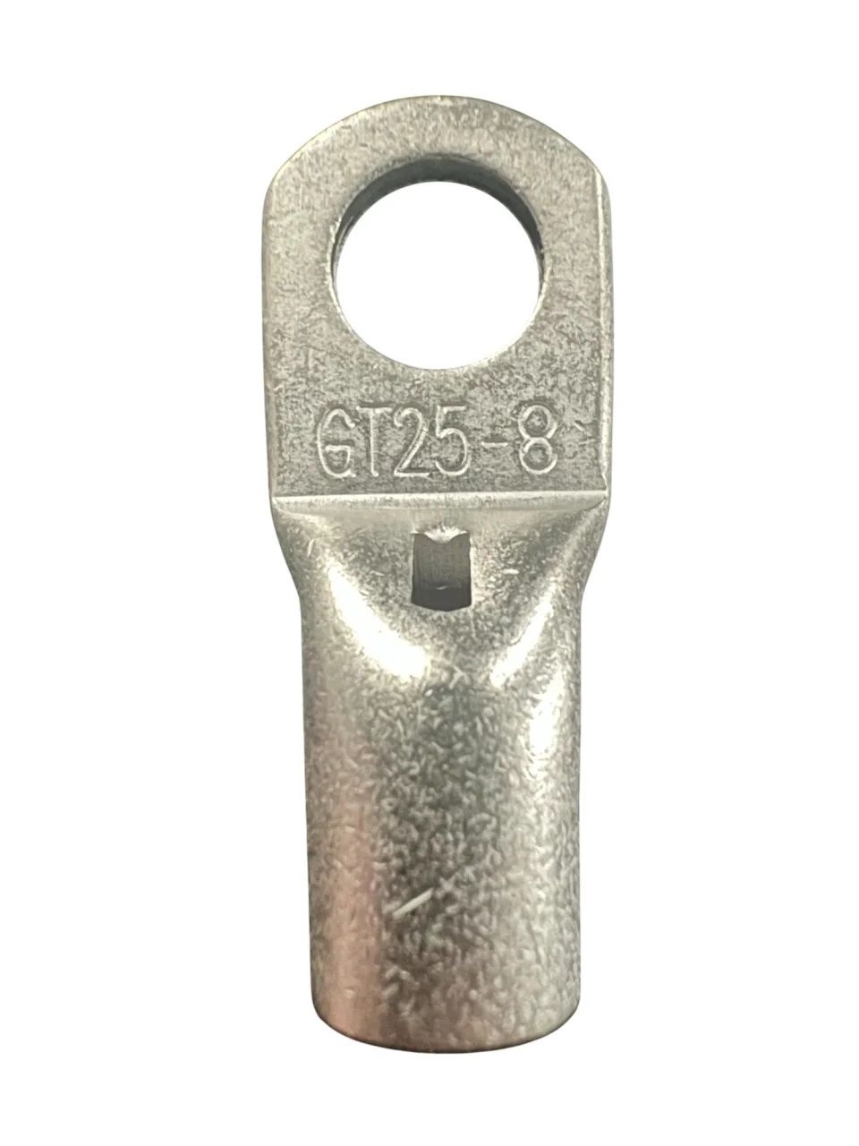 GT258 - Papuc cupru electrolitic neizolat, cu gaura surub M8, pentru fir de 25mmp reprezintă alegerea ideală pentru conexiuni electrice sigure și durabile. Acești papuci sunt fabricați din cupru de înaltă puritate, placat cu cositor pentru o rezistență excelentă la coroziune, fiind potriviți pentru aplicații în medii industriale, auto sau comerciale.