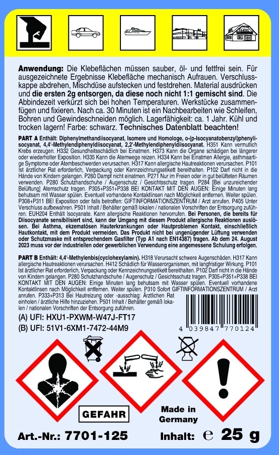 STC Adeziv pentru Plastic 2K PU 1 minut + 2 mixere, 25 g – cod 7701-125 este un adeziv poliuretanic bicomponent cu întărire foarte rapidă, conceput pentru reparații imediate ale componentelor din plastic utilizate în industria auto. Formula 2K (două componente) asigură reacție chimică rapidă și fixare în aproximativ 1 minut, fiind ideală pentru intervenții urgente și reparații rapide în atelier. Oferă aderență excelentă pe o gamă variată de materiale plastice, inclusiv elemente de caroserie, bare, suporturi și alte componente din plastic. După întărire, adezivul poate fi șlefuit și revopsit, fiind compatibil cu procesele standard de pregătire și finisare auto. Setul include 2 mixere statice pentru dozare corectă și amestec uniform, asigurând aplicare precisă și rezultate constante. Ambalajul de 25 g este potrivit pentru reparații punctuale și lucrări rapide în ateliere auto sau centre de recondiționare. Beneficii principale Adeziv poliuretanic bicomponent 2K Timp de întărire foarte rapid, aproximativ 1 minut Aderență ridicată pe materiale plastice auto Poate fi șlefuit și revopsit Include 2 mixere pentru aplicare precisă Alege STC Adeziv pentru Plastic 2K PU 1 minut 25g pentru reparații rapide, eficiente și profesionale ale pieselor din plastic auto. STC Adeziv Plastic 2K 1 min – lipire ultra-rapidă. Reparații rapide pentru piese din plastic auto. Aderență puternică și întărire în 1 minut. Include 2 mixere pentru aplicare precisă. Ai nevoie de un adeziv cu întărire extrem de rapidă pentru plastic auto? STC Adeziv 2K PU 1 minut 25g oferă fixare imediată, rezistență ridicată și posibilitatea de șlefuire și revopsire pentru reparații profesionale.Ce spun clientii