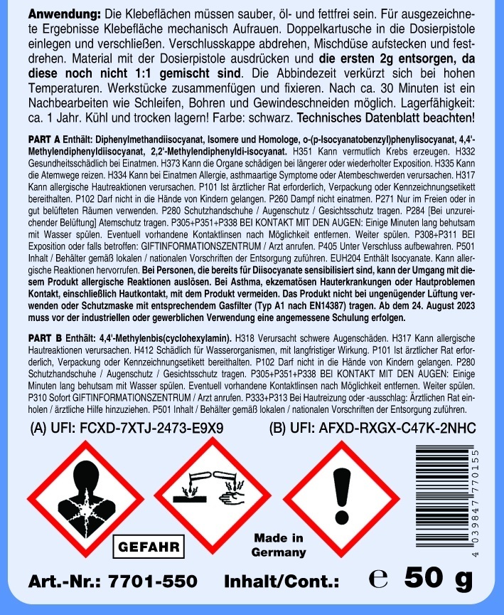 STC Adeziv Plastic PUR 2K 5 minute, cartuș dublu 50 g – cod 7701-550 este un adeziv poliuretanic bicomponent de înaltă performanță, conceput pentru reparații rapide și durabile ale componentelor din plastic utilizate în industria auto. Formula 2K (două componente) asigură întărire rapidă în aproximativ 5 minute și dezvoltă rezistență mecanică ridicată, fiind ideală pentru repararea barelor, elementelor de caroserie, suporturilor sau altor piese din plastic. Cartușul dublu permite dozare precisă și amestec automat prin mixer static, asigurând aplicare uniformă și rezultate constante. După întărire, adezivul poate fi șlefuit, găurit sau revopsit, fiind compatibil cu procesele standard de pregătire și finisare auto. Este recomandat pentru utilizare profesională în ateliere auto, service-uri și centre de recondiționare. Ambalajul de 50 g este potrivit pentru intervenții punctuale și reparații rapide care necesită rezistență structurală. Beneficii principale Adeziv poliuretanic bicomponent 2K Întărire rapidă în aproximativ 5 minute Rezistență mecanică ridicată Poate fi șlefuit și revopsit Cartuș dublu pentru dozare precisă Alege STC Adeziv Plastic PUR 2K 5 minute 50g pentru reparații rapide, sigure și profesionale ale pieselor din plastic auto. STC Adeziv Plastic 2K 5 min – rezistență ridicată. Reparații rapide pentru bare și piese plastic. Cartuș dublu 50g pentru aplicare precisă. Lipire profesională plastic auto. STC Adeziv 2K 5 min Adeziv plastic 50g Reparații bare auto PUR 2K profesional Ai nevoie de un adeziv puternic pentru reparații rapide ale pieselor din plastic auto? STC Adeziv Plastic PUR 2K 5 minute 50g oferă întărire rapidă, rezistență structurală și compatibilitate cu procesul de vopsire.Ce spun clientii
