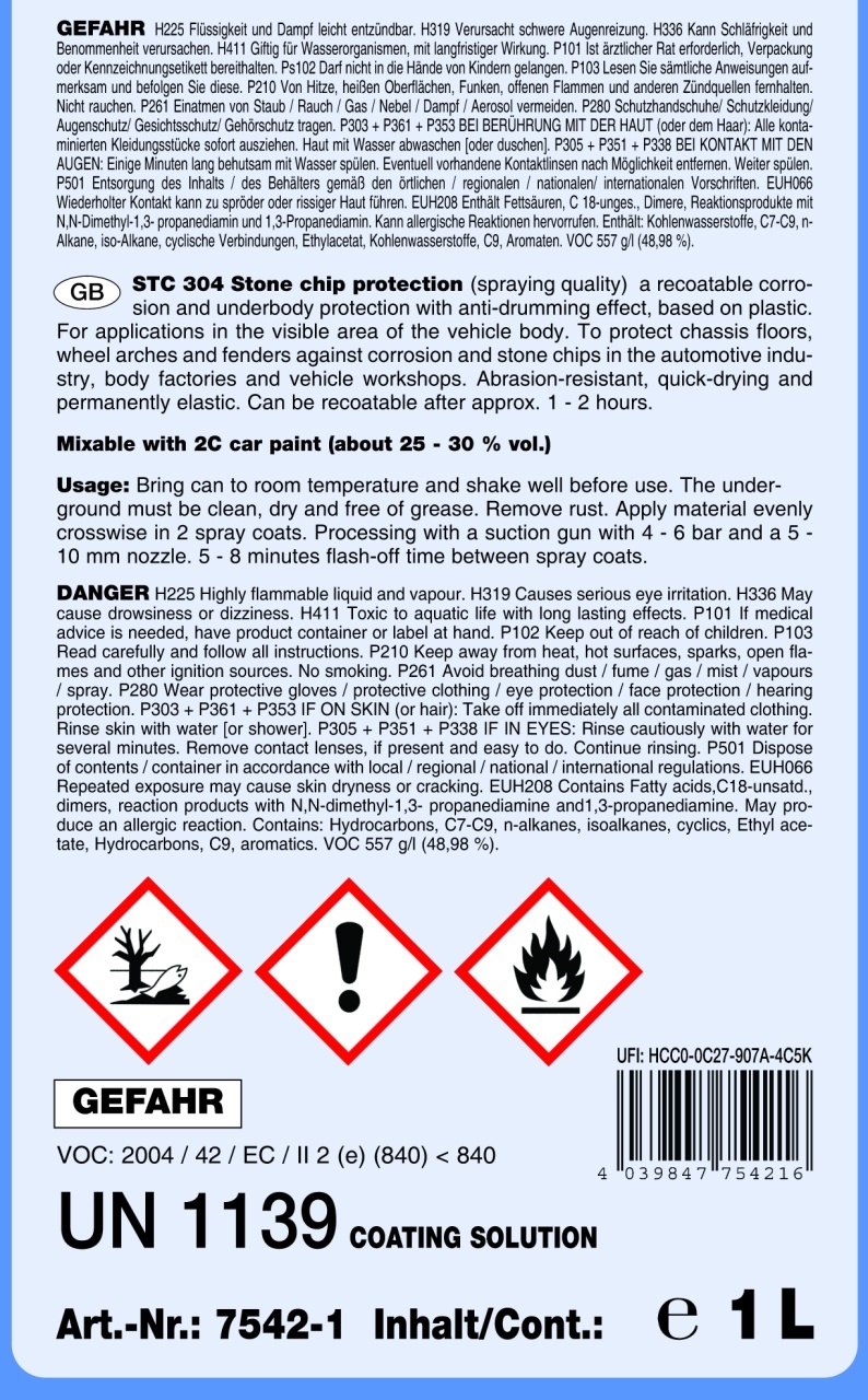 Protecția împotriva ciobiturilor STC, pulverizabilă, de 1 L (302 negru, 303 gri deschis, 304 alb), este o protecție permanentă împotriva ruginii, vopsibilă, pentru podelele vehiculelor, intrările și pasajele roților. Datorită efectului antizgomot foarte bun, este potrivit și pentru portbagaj, capote etc. Aderență foarte bună, rezistent la impact și zgârieturi și uscare rapidă, permanent elastic chiar și în cazul fluctuațiilor mari de temperatură, poate fi vopsit și este rezistent la curățarea la rece după uscare. Gata de pulverizare într-o cutie standard de 1 litru pentru pistoale de aspirație. Caracteristici: uscare rapidă vopsibil permanent elastic rezistent la impact și zgârieturi cu efect anti-zgomot foarte bun negru (302) / gri deschis (303) / alb (304) oferă o protecție excelentă împotriva așchiilor de pietriș și a influențelor climatice Poate fi amestecat cu vopseaua auto originală 2K (conținut de vopsea aprox. 25 - 30%) Date tehnice: Culoare: negru (302) / gri deschis (303) / alb (304) Valoare COV: Acoperire: 2,0 m²/l (la 500 μm DFT) Bază: bază din plastic Domeniu de aplicare: Ca protecție vopsibilă împotriva ciobiturilor de pietricele, protecție a caroseriei și a părții inferioare a caroseriei pentru o protecție permanentă împotriva ruginii pentru arcadele roților, podelele vehiculelor și intrările. Acoperire: 2,0 m²/l (la 500 μm DFT) Pentru o descriere detaliată a produsului, consultați fișa tehnică!Ce spun clientii