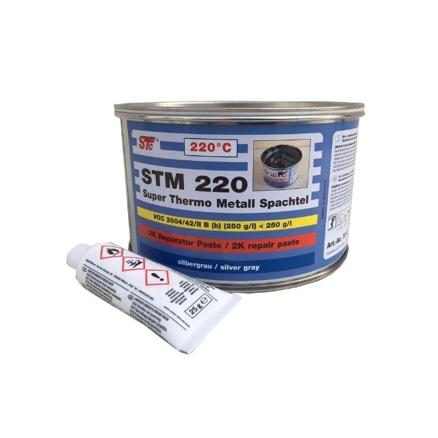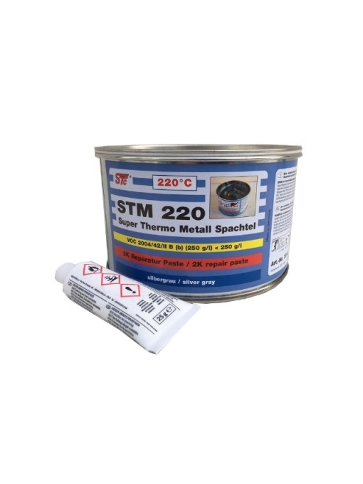STM 220 Super Thermo Metall este o masă plastică bicomponentă (2K) de înaltă performanță, formulată special cu particule de aluminiu pentru repararea profesională a pieselor turnate. Este soluția ideală pentru reparații structurale și estetice pe suprafețe din aluminiu sau fier, oferind o alternativă modernă și rapidă la cositorirea tradițională. De ce să alegi STM 220 Super Thermo Metall? Rezistență Termică Excepțională: Menține o aderență perfectă chiar și la expunere prelungită (30 min) la temperaturi de până la 220 °C . Este produsul ideal pentru componente care urmează să fie vopsite în câmp electrostatic sau care lucrează în medii calde. Înlocuitor Versatil pentru Cositor: În tinichigeria auto, acționează ca un substituent excelent pentru cositorirea clasică (Zinnaustausch), fiind perfect pentru uniformizarea sudurilor și mascarea imperfecțiunilor de caroserie. Reparații de Turnătorie: Special conceput pentru umplerea suflurilor (găuri de turnare) și sigilarea fisurilor în blocurile motor, carcase de transmisie sau alte piese de fontă/alu. Aderență și Duritate: Garantează o priză extremă pe tablă de oțel, piese turnate din fier și aluminiu. Specificații Tehnice: Timp de întărire: Rapid, între 20 - 25 minute (la temperatura camerei). Culoare: Argintiu metalizat (pentru o finisare discretă pe piese de aluminiu). Densitate: cca. 1,44 g/cm³. Ambalare: Cutie de 1,4 kg (ideal pentru utilizare intensivă în industrie) Domenii de Aplicare: Industria Auto: Repararea blocurilor motor, chiulaselor și elementelor de caroserie supuse căldurii. Mentenanță Industrială: Chituirea și etanșarea pieselor metalice cu defecte de turnare sau uzură. Ateliere de Vopsitorie: Perfect pentru piese ce necesită tratament termic ulterior. Rezistent la tempereturile din vopsitoriile in camp electrostatic.Ce spun clientii