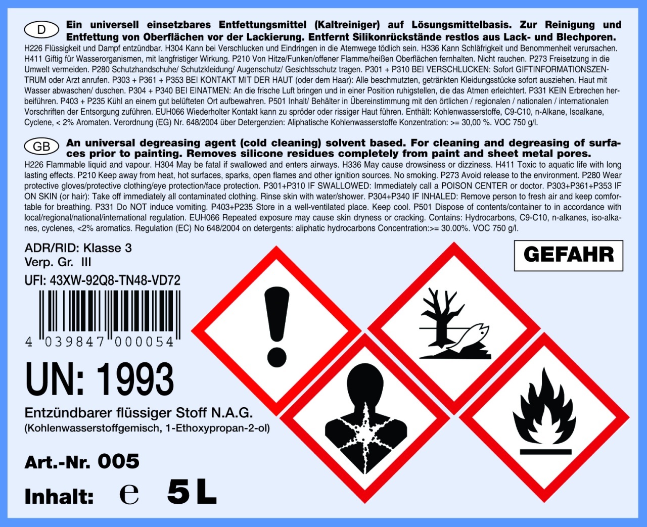 Un degresant pe bază de solvent (curățător la rece) universal aplicabil. Îndepărtează rapid și sigur siliconii, grăsimea, uleiul și ceara reziduală. Se evaporă rapid și fără reziduuri, cu un miros ușor. Pentru curățarea și degresarea suprafețelor înainte de vopsire. Nu conține solvenți agresivi și nu atacă vopselele întărite. Putere excelentă de dizolvare și consum redus de material. Descrierea produsului Un degresant pe bază de solvent (curățător la rece) universal aplicabil. Pentru curățarea și degresarea suprafețelor înainte de vopsire. Proprietăți: Putere excelentă de dizolvare Consum redus de material Curățare intensivă a pieselor tratate Auto-uscare (rată scăzută de evaporare) Nu lasă reziduuri Miros ușor Antistatic Consumul este de aproximativ 1/4 L pe m² Date tehnice: Valoare COV: 100% --> 740 g/l Densitate: 0,74 g/cm³ Rată de evaporare: 7 (eter = 1) Domenii de aplicare: Agentul de îndepărtare a siliconului poate fi utilizat în procese de imersie și spălare. Materialul este foarte eficient în diverse tipuri de echipamente de curățare.Ce spun clientii