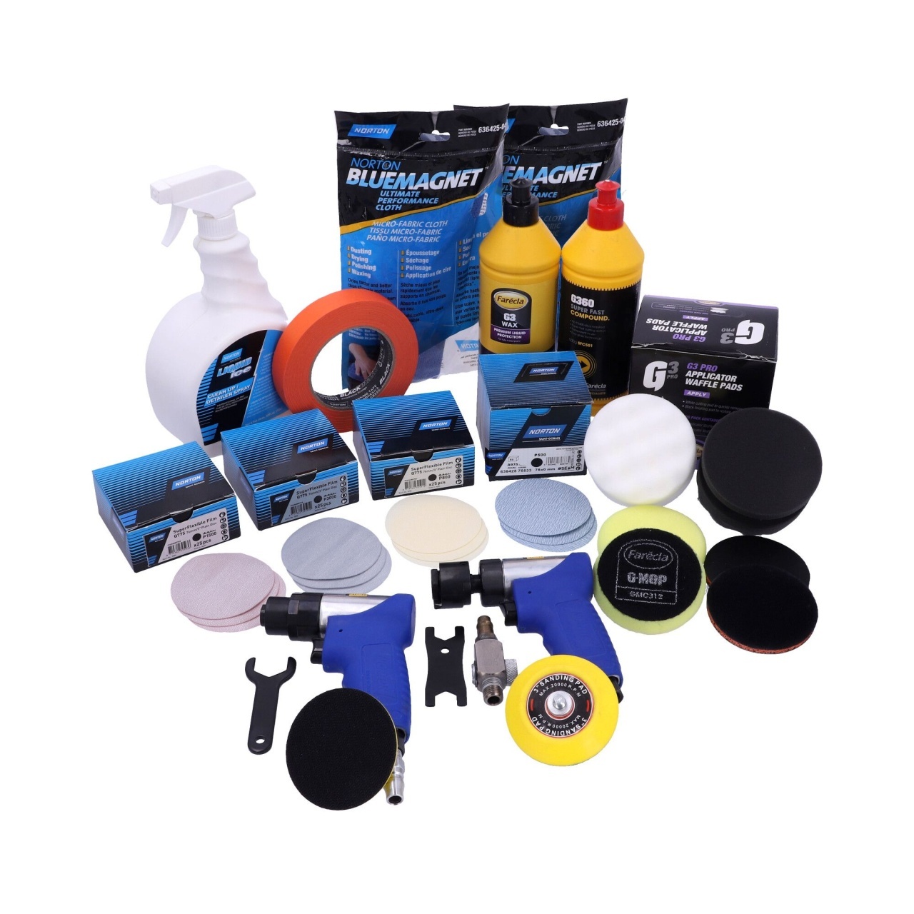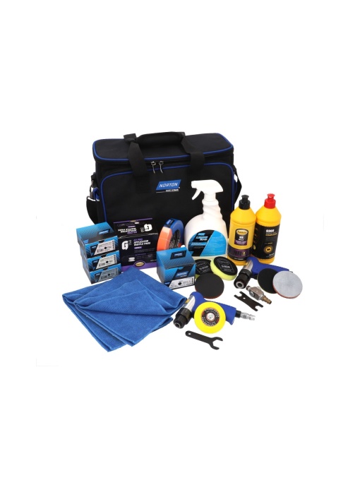 De ce introducem noul kit? În urma ultimelor lansări de produse noi în gama de abrazivi Norton și a unei extinderi a ofertei noastre cu compuși Farecla, am decis să facem upgrade setului de reparare a farurilor pentru a oferi clienților noștri cea mai bună soluție de suprafață pentru restaurarea farurilor. Noul nostru kit de reparare a farurilor este o soluție completă pas cu pas pentru a reînnoi farurile mașinii rapid și eficient. Setul conține un sortiment de mașini, discuri de șlefuit și compuși de lustruit potriviti pentru îndepărtarea zgârieturilor și reînnoirea unei suprafețe clare pe farurile uzate în mai puțin de 15 minute! Toate produsele vin într-o pungă de instrumente Norton la îndemână, care poate fi refolosită! Headlight Repair Kit DESCRIPTION QTY IN KIT Article No. Mini Orbital Sander 76mm (pneum) 1 78072769407 Mini Rotary Polisher 76mm (pneum) 1 Orange Tape 1 Foam interface 76mm 2 Norton A975 DISCS 76x0 P500 50 pcs Norton SuperFlexible DISCS 76x0 Q775 P800 25 pcs Norton SuperFlexible DISCS 76x0 Q775 P1500 25 pcs Norton SuperFlexible DISCS 76x0 Q775 P3000 25 pcs Farécla G360 Super Fast Compound 500g 1 Farécla G3 Wax Premium Liquid 500ml 1 Farécla G Mop 3" Yellow Compound Foam 2 Farécla G Pro applicator waffle pads (1 white + 1 black) 1 Norton Liquid Ice Detailer Spray - 1lt 1 Norton Blue Microfiber Cloths - 400x400-AAM 2 Norton Polybag 600D 38x23x28cm 1 Process chart 1Ce spun clientii