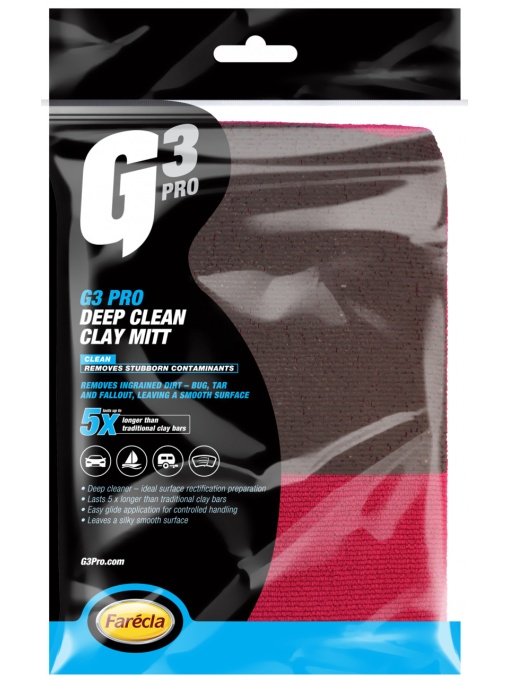 Revoluționarul și reutilizabil G3 Professional Deep Clean Clay Mitt folosește o tehnologie avansată de polimeri din cauciuc care îndepărtează cu ușurință murdăria înrădăcinată, insectele, petele de gudron și poluanții de pe vopsea, parbrize și faruri. O alternativă ușor de utilizat la un tradiționalele bare de argila. Ușor de folosit Îndepărtați murdăria înrădăcinată Durează de până la 5 ori mai mult decât batoanele tradiționale de argila. Nu trebuie aruncata în caz de este scăpată pe jos, spre deosebire de argilă. IMPORTANT – G3 Pro Deep Clean Clay Mitt necesită lubrifiant pentru aplicare; Utilizați cu un G3 Pro Detailer sau șampon pentru a lubrifia suprafața, permițând mănușii să alunece pe suprafață.Ce spun clientii