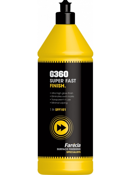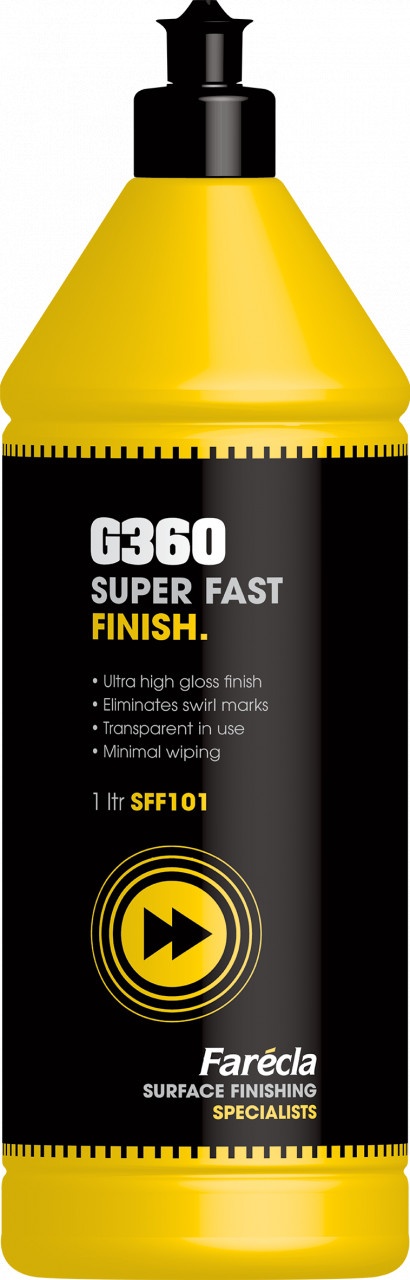 Formula nouă. Adâncime sporită a luciului. Fără efort. Excelent pe culori închise. G360 Super Fast Finish, utilizat cu o spumă de finisare neagră flexibilă G Mop, alunecă cu ușurință pe suprafață, eliminând urmele de lasate de discurile abrazive cat și alte defecte minore, foarte rapid și cu puțin efort, lăsând un finisaj lucios profund îmbunătățit. Transparent în utilizare, operatorul poate vedea rezultatele permanente. Noua formulă i-a îmbunătățit proprietățile de manipulare, astfel încât să ajungeți la acel finisaj impecabil pe negru și culori închise considerabil mai repede. E|ste, de asemenea, un luciu mai profund, plus ștergerea este mai rapidă. Dincolo de performanța produsului, noua formulă se mândrește și cu acreditări de mediu îmbunătățite, cu conținutul de COV redus la aproape zero. Ideal pentru culorile mai închise, după utilizarea sistemului G360 Super Fast Compound. COD FARECLA: SFF101 COD SG: 780727 60453Ce spun clientii