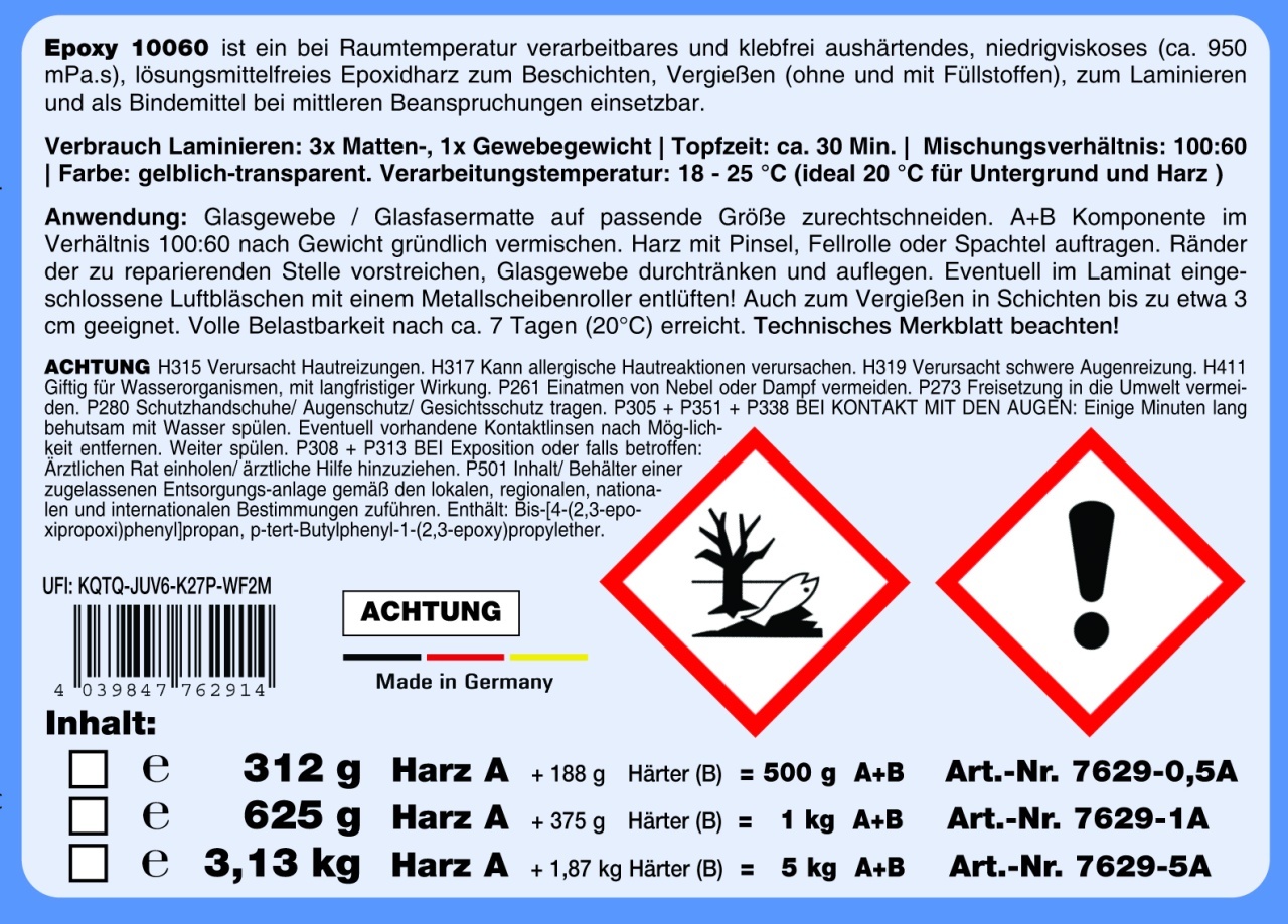 Descriere produs: STC Rășină Epoxy 10060 2K este un sistem epoxidic profesional bicomponent (A + B) , special formulat pentru laminare, turnare și aplicații de modelare . Oferă o transparență excelentă, rezistență mecanică ridicată și aderență superioară pe o gamă largă de materiale – lemn, fibră de sticlă, metal, carbon, beton sau piatră. Datorită vâscozității sale echilibrate, produsul este ideal atât pentru impregnarea straturilor de fibră (laminare manuală) , cât și pentru turnări în matrițe sau forme decorative . Caracteristici principale: ⚗️ Sistem bicomponent (A – rășină / B – întăritor) ⚖️ Raport de amestec precis pentru rezultate constante și fără bule de aer 💎 Transparență excelentă , potrivită pentru aplicații estetice și decorative 🔩 Rezistență mecanică și chimică ridicată 🧱 Aderență foarte bună pe diverse substraturi ⏱️ Timp de lucru optim , care permite manipularea ușoară înainte de întărire completă 🔥 Rezistență termică bună după polimerizare Aplicații recomandate: Laminare cu fibră de sticlă, fibră de carbon sau kevlar Turnare de piese decorative, matrițe, bijuterii sau elemente tehnice Reparații și consolidări structurale Acoperiri de suprafețe (lemn, piatră, beton) cu efect lucios și protector Avantaje: ✅ Ușor de utilizat – se amestecă rapid și se aplică uniform ✅ Asigură un finisaj neted, dur și clar ✅ Nu se contractă la întărire ✅ Aderență excelentă și durabilitate în timp Ambalaj: Set complet A+B – 1 kg total (rășină + întăritor) Culoare: Transparent Utilizare: Laminare și turnare profesionalăCe spun clientii