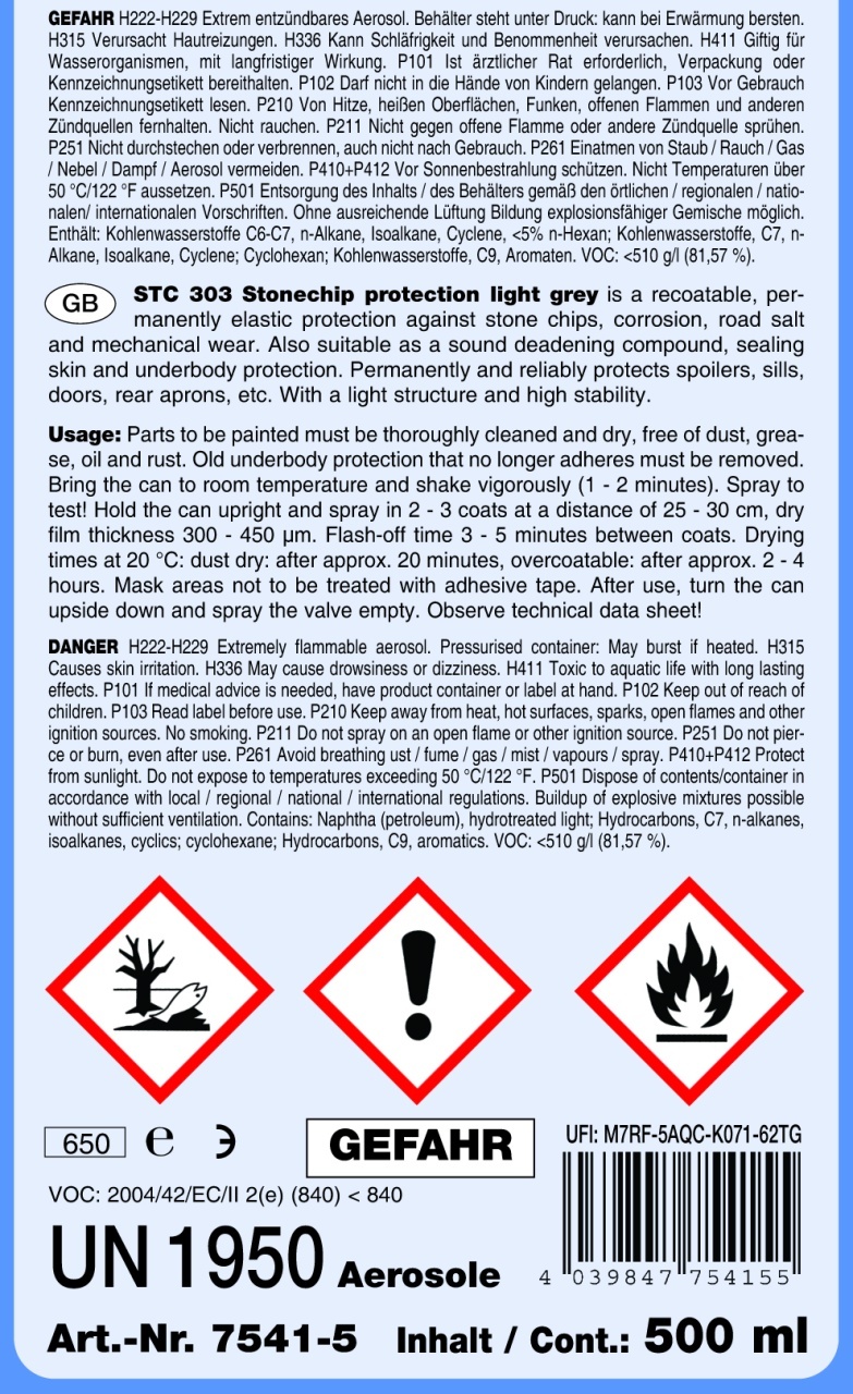 Protecția împotriva ciobiturilor STC, pulverizabilă, de 500ml (302 negru, 303 gri deschis, 304 alb), este o protecție permanentă împotriva ruginii, vopsibilă, pentru podelele vehiculelor, intrările și pasajele roților. Datorită efectului antizgomot foarte bun, este potrivit și pentru portbagaj, capote etc. Aderență foarte bună, rezistent la impact și zgârieturi și uscare rapidă, permanent elastic chiar și în cazul fluctuațiilor mari de temperatură, poate fi vopsit și este rezistent la curățarea la rece după uscare. Gata de pulverizare într-o cutie standard de 500ml spray. Caracteristici: uscare rapidă vopsibil permanent elastic rezistent la impact și zgârieturi cu efect anti-zgomot foarte bun negru (302) / gri deschis (303) / alb (304) oferă o protecție excelentă împotriva așchiilor de pietriș și a influențelor climatice Poate fi amestecat cu vopseaua auto originală 2K (conținut de vopsea aprox. 25 - 30%) Date tehnice: Culoare: negru (302) / gri deschis (303) / alb (304) Valoare COV: Acoperire: 2,0 m²/l (la 500 μm DFT) Bază: bază din plastic Domeniu de aplicare: Ca protecție vopsibilă împotriva ciobiturilor de pietricele, protecție a caroseriei și a părții inferioare a caroseriei pentru o protecție permanentă împotriva ruginii pentru arcadele roților, podelele vehiculelor și intrările. Acoperire: 2,0 m²/l (la 500 μm DFT) Pentru o descriere detaliată a produsului, consultați fișa tehnică!Ce spun clientii