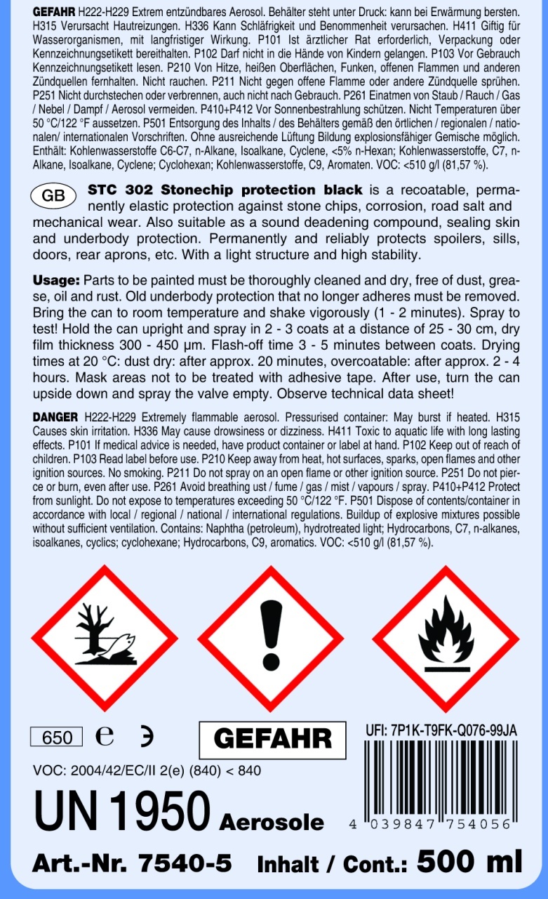 STC 302 Spray Insonorizant/Antifon PVC Negru, pulverizabilă, de 500ml (302 negru, 303 gri deschis, 304 alb), este o protecție permanentă împotriva ruginii, vopsibilă, pentru podelele vehiculelor, intrările și pasajele roților. Datorită efectului antizgomot foarte bun, este potrivit și pentru portbagaj, capote etc. Aderență foarte bună, rezistent la impact și zgârieturi și uscare rapidă, permanent elastic chiar și în cazul fluctuațiilor mari de temperatură, poate fi vopsit și este rezistent la curățarea la rece după uscare. Gata de pulverizare într-o cutie standard de 500ml spray. Caracteristici: uscare rapidă vopsibil permanent elastic rezistent la impact și zgârieturi cu efect anti-zgomot foarte bun negru (302) / gri deschis (303) / alb (304) oferă o protecție excelentă împotriva așchiilor de pietriș și a influențelor climatice Poate fi amestecat cu vopseaua auto originală 2K (conținut de vopsea aprox. 25 - 30%) Date tehnice: Culoare: negru (302) / gri deschis (303) / alb (304) Valoare COV: Acoperire: 2,0 m²/l (la 500 μm DFT) Bază: bază din plastic Domeniu de aplicare: Ca protecție vopsibilă împotriva ciobiturilor de pietricele, protecție a caroseriei și a părții inferioare a caroseriei pentru o protecție permanentă împotriva ruginii pentru arcadele roților, podelele vehiculelor și intrările. Acoperire: 2,0 m²/l (la 500 μm DFT) Pentru o descriere detaliată a produsului, consultați fișa tehnică!Ce spun clientii