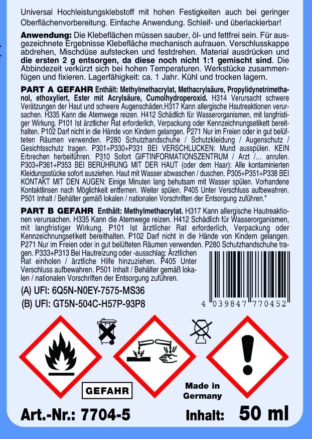 STC Adeziv universal este un adeziv de înaltă performanță, pe bază de metacrilat, cu 2 componente. Poate fi folosit universal în multe domenii, procesare și întărire rapidă. Poate lipi aproape orice fel de material plastic, lem, ceramica, metal, etc Pentru aplicare este necesar un Pistol pentru adezvi bicomponenti 7700 si capete de amestecare 7703-1 Caracteristici: poate fi folosit în interior și în exterior Adeziv metacrilat de înaltă performanță aderență excelentă la metal, plastic și multe alte materiale șlefuabil, vopsibil rezistență ridicată la tracțiune, forfecare și exfoliere rezistenta foarte buna la substante chimice, benzina, apa si caldura Date tehnice: Culoare: alb murdar/galben = galben deschis (mixt) Raport de amestec: 1:1 (volum) Durată de viață: 3 min. Forța mâinii: 6 min Rezistență la temperatură: - 40 °C până la + 120 °C Domenii de aplicare: Construcția caroseriei și a vehiculului (de exemplu, bare de protecție, radiatoare, iluminare, mânere de prindere, piese de consolă, spoilere, suporturi pentru telefon și difuzoare). Construcții metalice, tehnologia materialelor plastice, prelucrarea lemnului, construcții de târguri, modelare, electrotehnică, design interior, tehnologie de prindere, bunuri de uz casnic, jucării, inginerie mecanică și multe altele. Pentru descrierea detaliată a produsului vezi fișa tehnică!Ce spun clientii