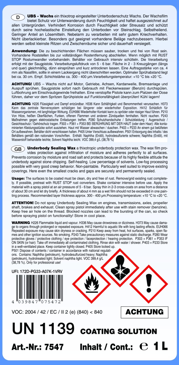Ceară de protecție pentru caroserie sub formă de peliculă protectoare închisă, chiar și cu o grosime subțire a stratului. Previne coroziunea cauzată de umezeală sau sare de deplasare, protejează partea inferioară a caroseriei de așchiile de pietriș. O folie protectoare elastică cu proprietăți de fluaj foarte bune. Dacă este deteriorată de așchii de piatră sau lucruri similare, această folie se va sigila din nou în foarte scurt timp. Caracteristici: bituminos nu poate fi vopsit peste potrivit pentru toate suprafețele comune pastă toxitropă ideal pentru repararea suprafețelor existente procesare cu ceață redusă folie de protecție închisă chiar și cu o grosime subțire a stratului asigură etanșarea sigură a celor mai mici crăpături și goluri Date tehnice: Culoare: negru Valoare COV: 435,4 g/l Domeniu de aplicare: Datorită proprietăților sale bune de infiltrare, ceara UBS este potrivită în special pentru repararea acoperirilor existente. Acest lucru asigură că până și cele mai mici crăpături și goluri sunt sigilate în siguranță și permanent. Poate fi utilizat pe toate suprafețele comune. Pentru o descriere detaliată a produsului, consultați fișa tehnică!Ce spun clientii